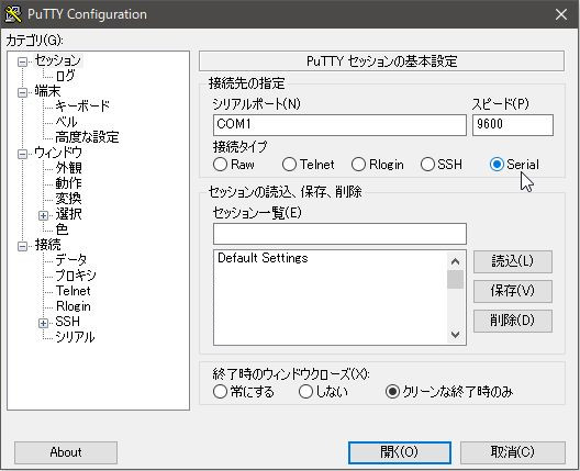 PuTTYの場合は図の左ペイン、設定メニューの最下位の「シリアル」をクリックすると設定できます。
