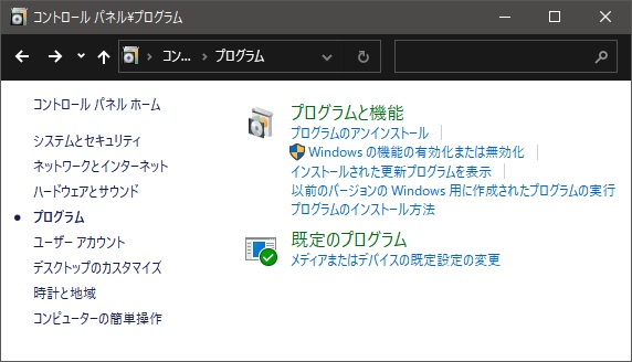 - コントロールパネル(カテゴリー表示)が立ち上がりますので「プログラム」を開きます。