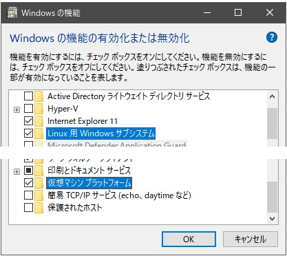 - [Windows の機能の有効化または無効化]をクリックし、図の2つを有効化します。