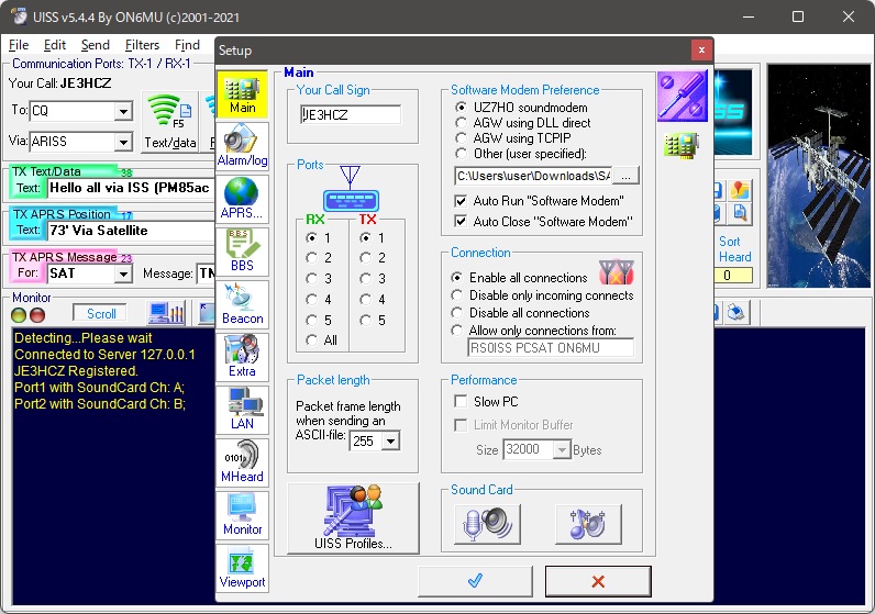 また、[Auto Run]、[Auto Close] にチェックしておくと、UISS 立ち上げに先立って soundmodem を立ち上げ、