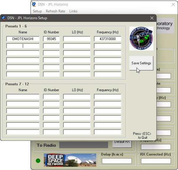 - PstRotatorのメニューバーからDSNを選択し、衛星名(ここではOMOTENASHI)をクリックすると、