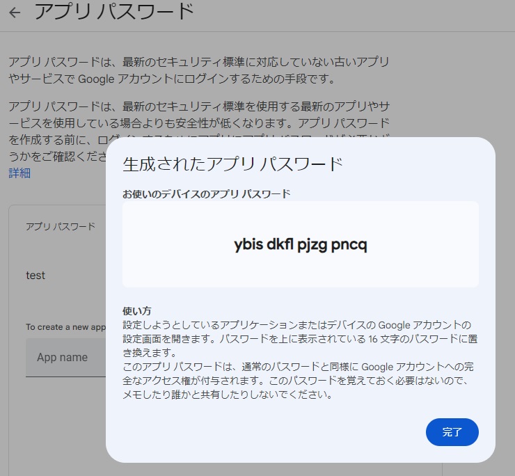 まだの場合は最初のメールソフト導入の前にGoogleのアプリパスワードを入手するをご覧ください。