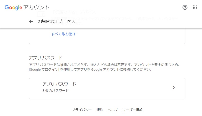 - 図のように、2段階認証プロセスが オン になっていれば、その中に入ると最下部に[アプリ パスワード]が表示されます。