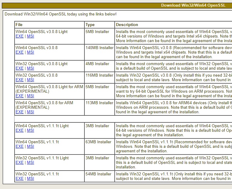 過日開発環境を Clang に変更したので、必要に迫られ Windows用 OpenSSL/TLS をインストールすることにしました。ソースをダウンロードしてコンパイルする方法も有るのですが、そのコンパイル環境も構築する必要が有るため今回はWindows用インストーラを作成してくれているサイトからダウンロードしました。