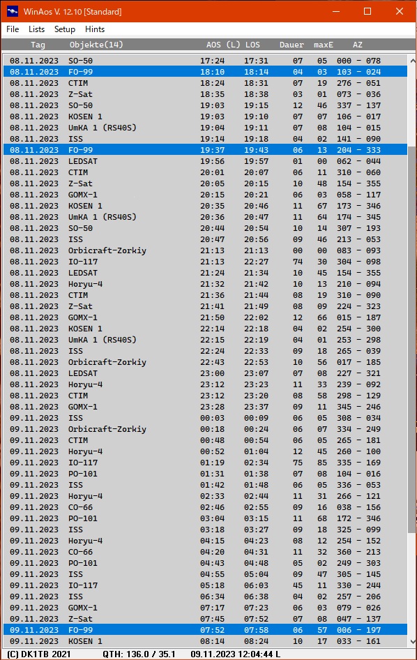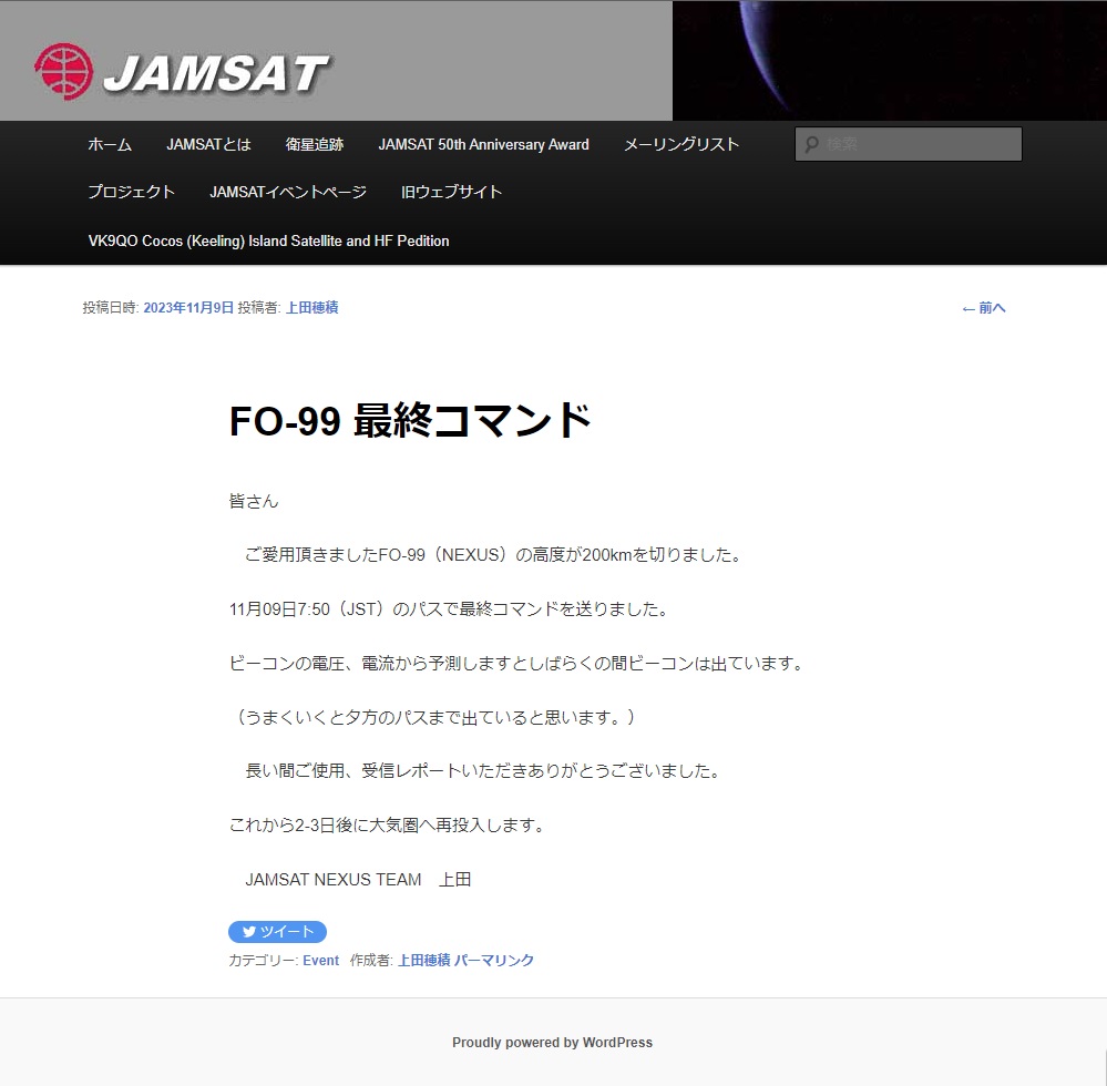 2023.11.9 07:50のパスで高度200kmを切り、最終コマンドが送信されました。(詳しくは下記をご覧ください。)