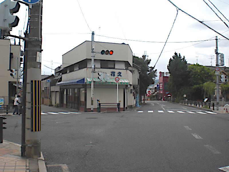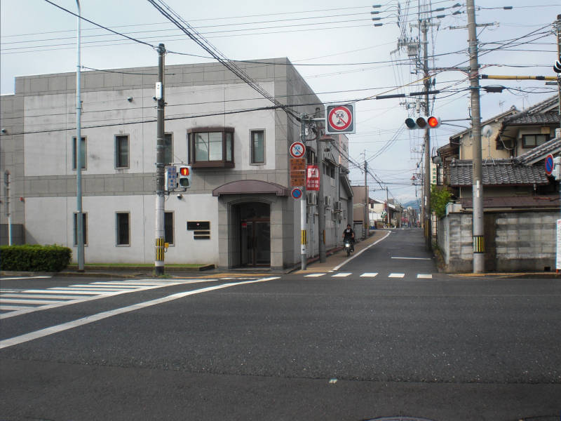 [西大路通西国街道]の交差点。この辺りでは西大路通りも南東向きとなり西国街道とは直角に交わる。