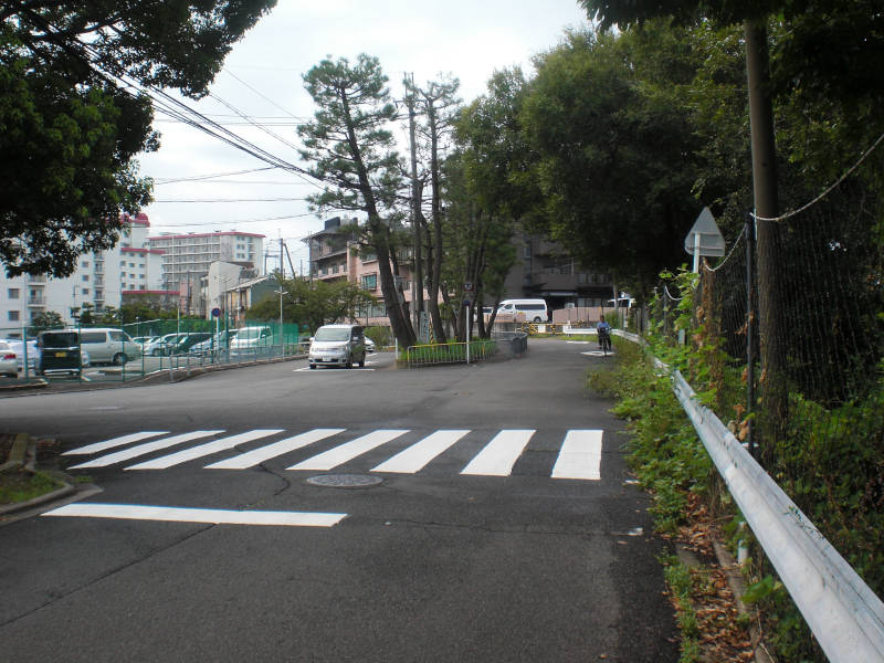 6,7本大樹の立つ一角に突き当たる。ここでは又物集女街道と合流することになる。横断歩道を渡って木々の中へ。さらに