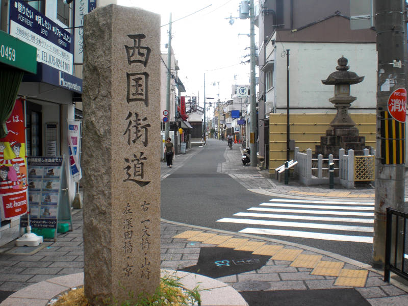 九条御前]の交差点から西国街道は南西の方角に向く。東西南北の枡目になっている京都からするといかにも旧街道らしい。