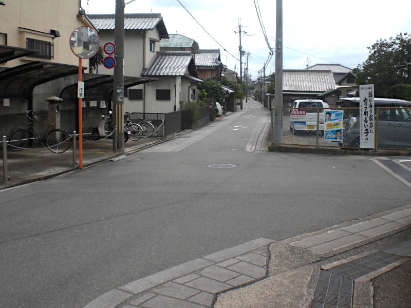 左折する以外には前方に三つの選択肢が有るが、今まで来た道から見るとほぼ直線である、最も左の道に進む。物集女街道は真ん中。
