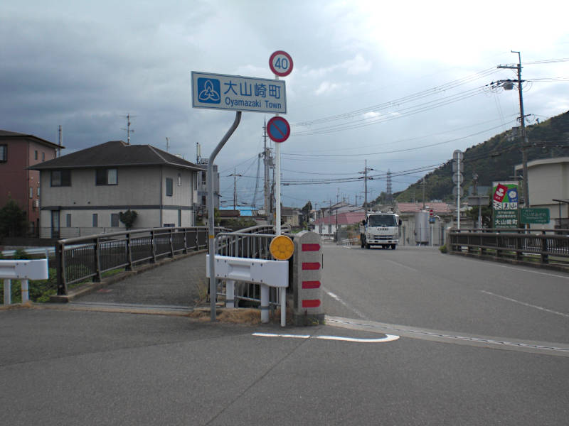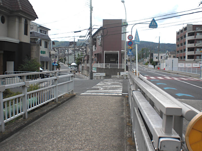 小さな川に掛かる小さな橋を渡ると直ぐに、西国街道は左へ逸れて行く。横断歩道の先の側道を歩いて行くと