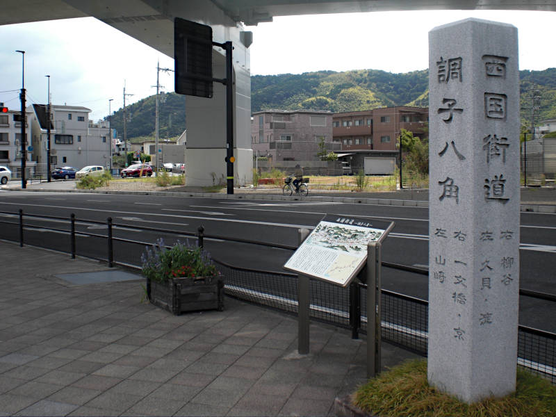 調子八角の道標は西国街道と丹波街道の分岐点に立っている。その丹波街道の真上を京都縦貫自動車道が走っている。