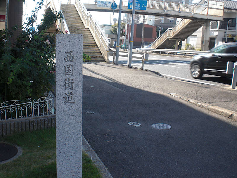 環状線の向こう側で右折して、それに沿って行くと環状線自体国道171号線に合流する。しばし歩いたところに西国街道の道標が有った。(11:28)