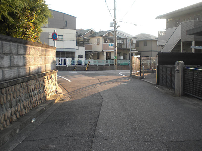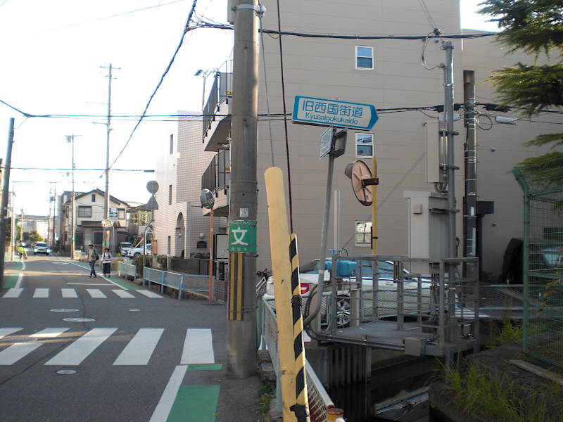 突き当たりを斜め右に取り、後は道なりに進んでいくと車道に出るが、西国街道はそのまま真っ直ぐ車道を斜めに横切る。