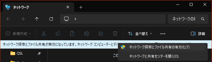 - このリボンをクリックするとメニューが表示されるので [ネットワーク探索とファイル共有の有効化] を選択する。