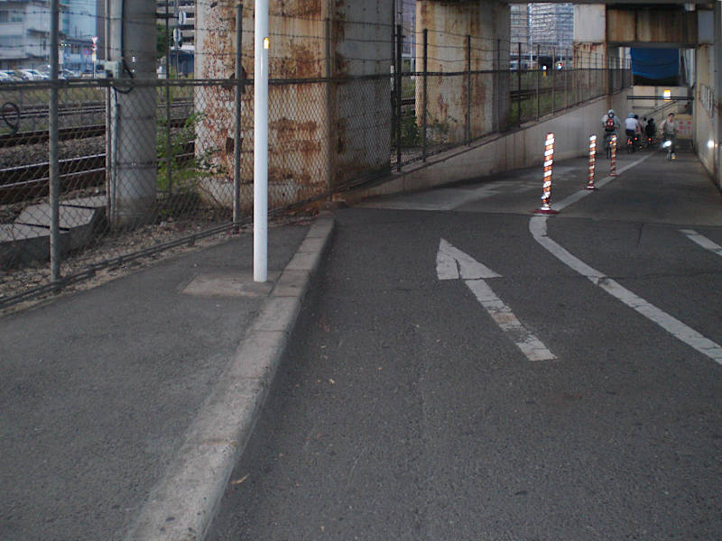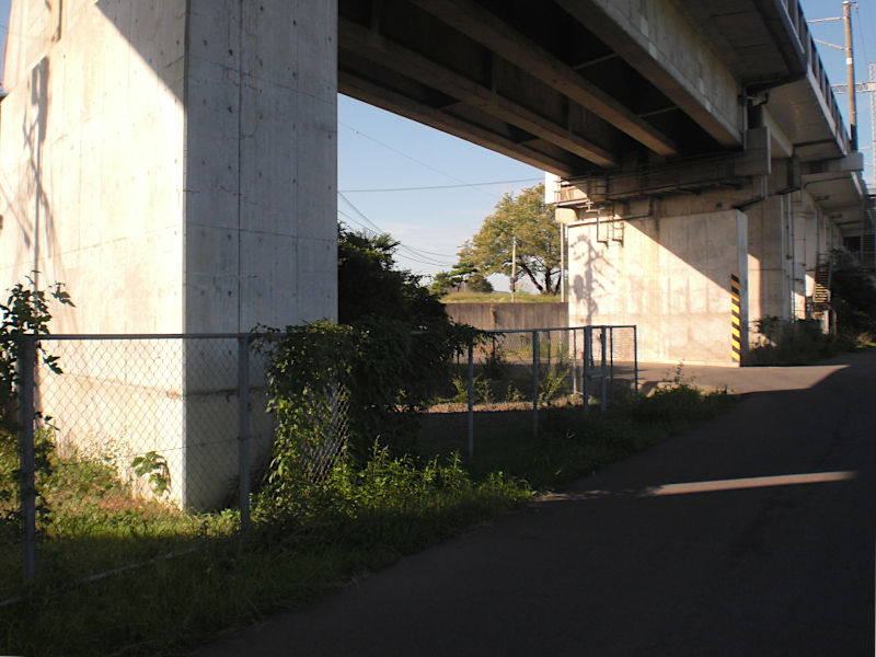 山陽新幹線の高架下にフェンスが有り、真っ直ぐには通り抜けられない。少し右手に迂回する。