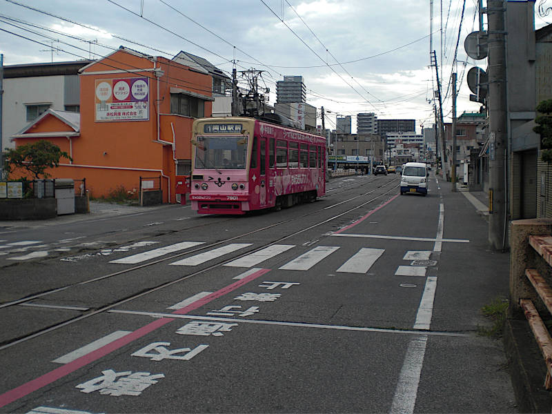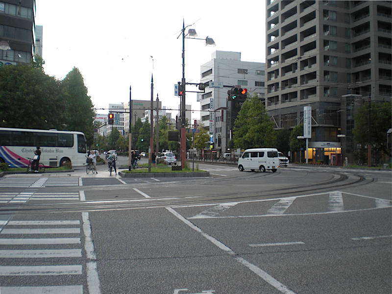 突き当たりのように見えていた交差点。トラムは右へ折れていくが前方に見える「