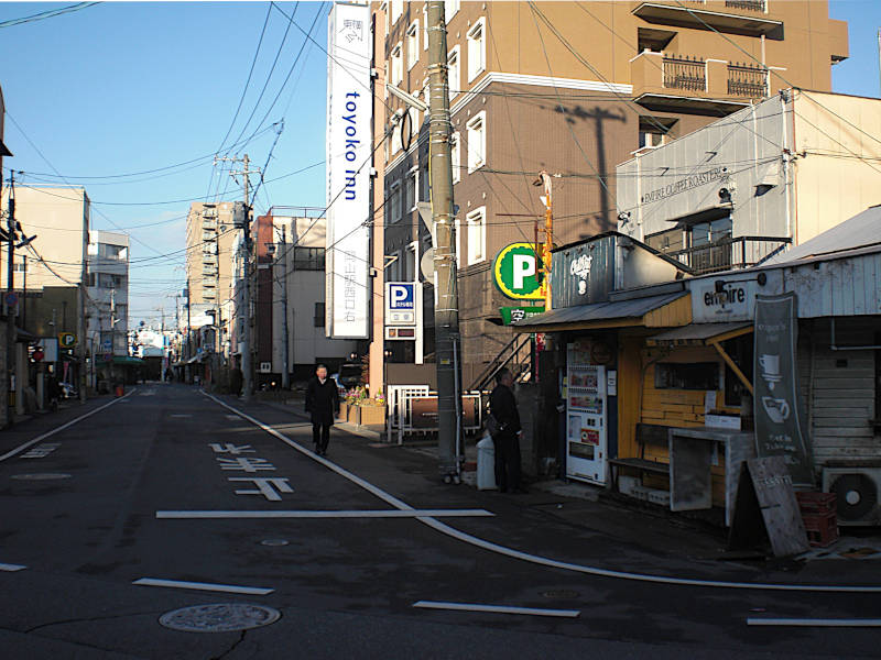 朝なのでまだシャッターが閉まってガランとした商店街を抜ける。