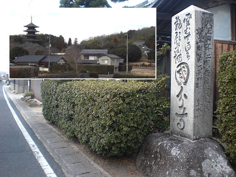 集落に入り右手を見ると五重塔が見える。立派な寺だなと思いながら歩いていると参道入口らしい所に石碑が有った。(14:03)