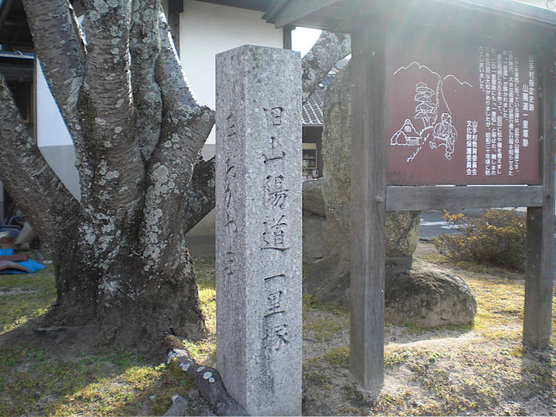 西国街道 西郡の一里塚跡」。昔は「一里松」と呼ばれて親しまれた松も昭和30年頃枯れたと有る。(14:50)