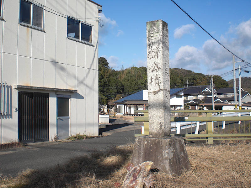 西国街道矢掛の一里塚跡」が左側に、民家の板壁に沿うように建っている。(12:18)