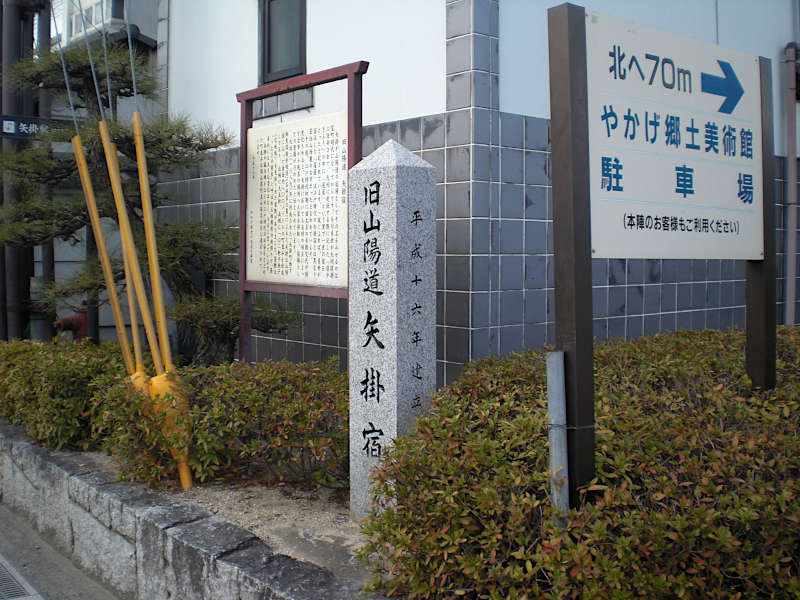 西国街道 旧山陽道矢掛宿の碑」。案内板に矢掛の読み方に付いての記述が有った。