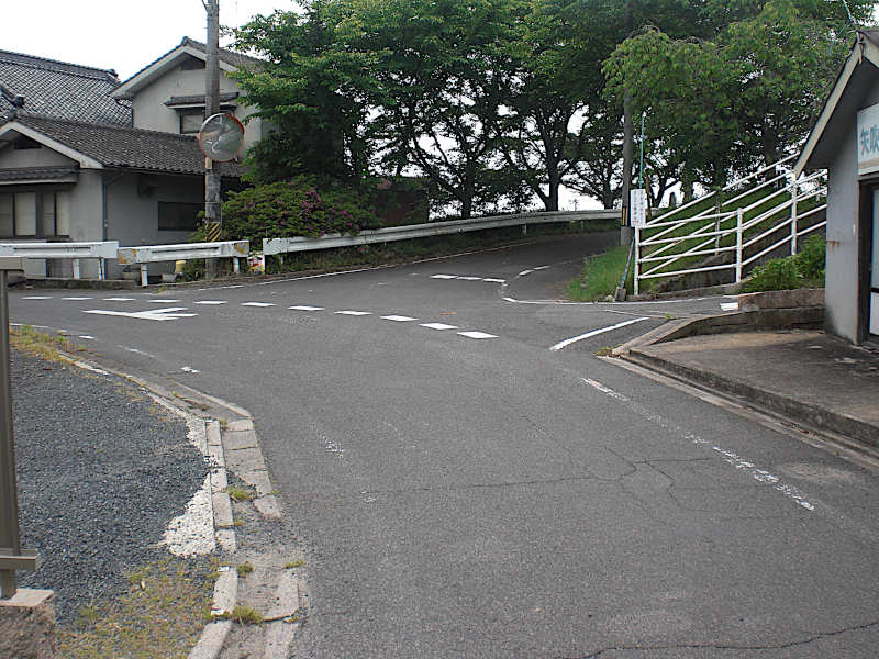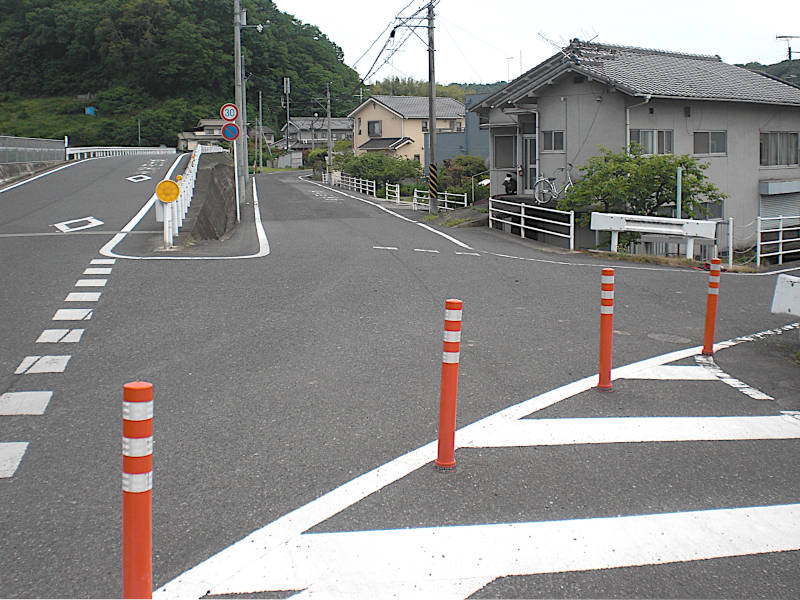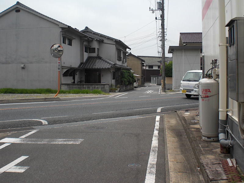 そのポイントである分岐点。横断歩道が無く、時間帯にも依るが交通量が多くカーブで危険。(16:13)