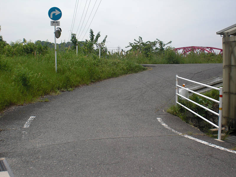 堤防から下りる車道の下をくぐり、道なりに右手へ下っていく。(15:02)