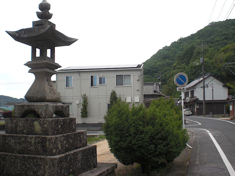 山裾伝いに少し行くと、またしても大きな灯篭が有り、堤防沿いの車道に合流する。(13:28)