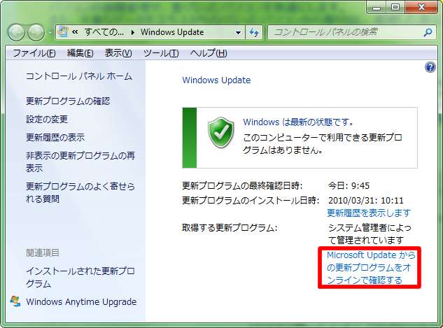 [Microsoft Updateからの更新プログラムをオンラインで確認する]をクリックします。
