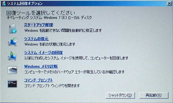 「システム回復オプション」というタイトルのダイアログボックスですが、言語が[日本語](グレイアウト:薄く見えるが選択できない)であるのと、
