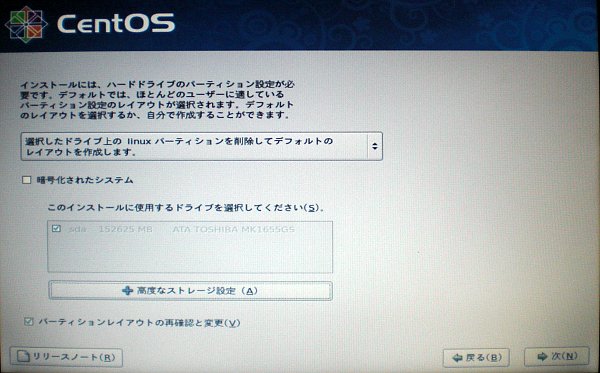 [選択したドライブ上の linux パーティションを削除してデフォルトのレイアウトを作成します。]というレイアウトが表示されているのは、