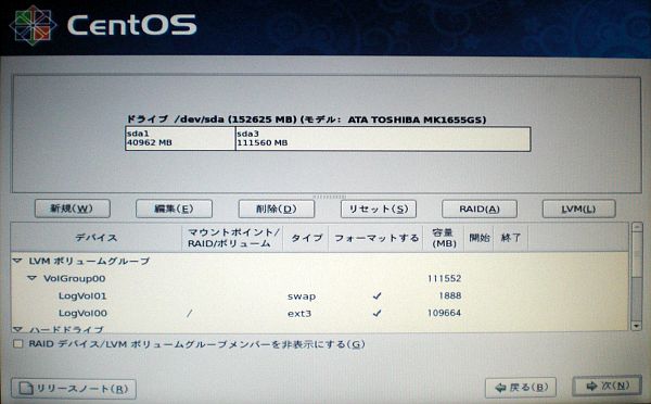 - ハードディスク・ドライブにパーティションを作成する設定画面です。ほとんどの場合、状況を判断して最適のレイアウトを表示してくれます。