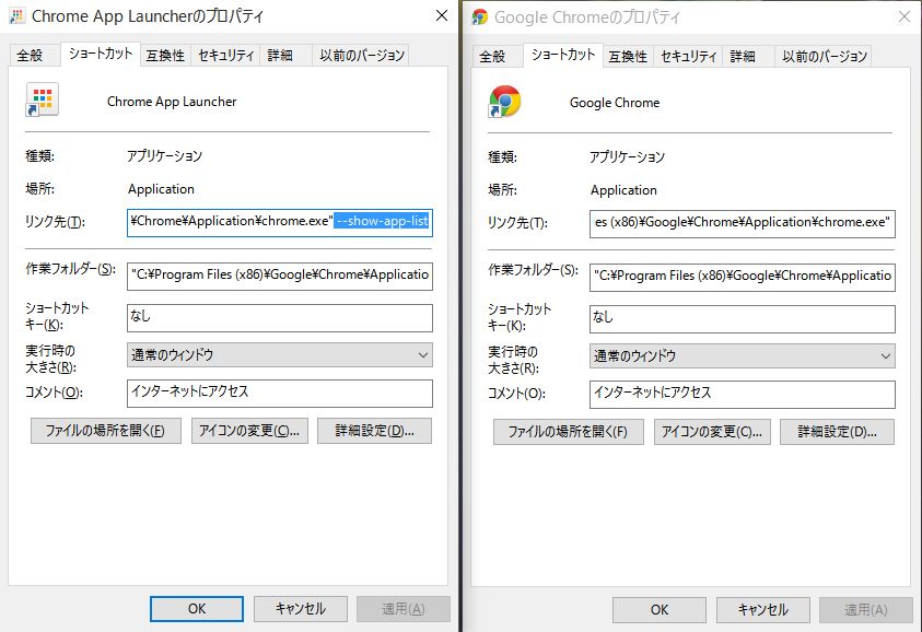まず,ランチャーが消えていないとして2つのアイコンの[プロパティ]を比較したのが次の図です。