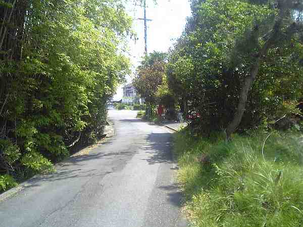 西の坂=秋葉坂)を下っていくと、大きく左カーブした車道に出る(左・右写真)。