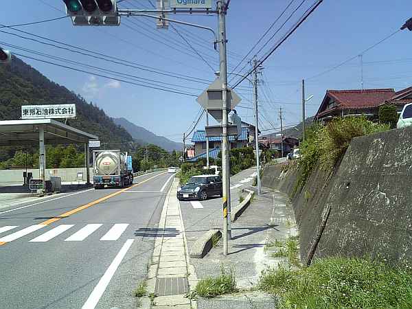 トンネルを出てきた19号線バイパスと旧19号線の交差点(下・左写真)。残念ながら横断歩道がない。