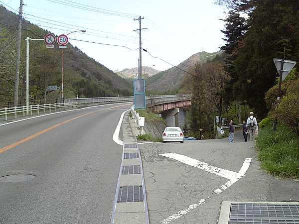 142号線の側道をしばらく行くと、橋の手前を川に沿って右へ迂回する(右・左写真)。