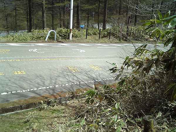 峠から初めての交差点(右・右写真)。車道(ビーナスライン)の向こう側にある小さな階段を上がる。