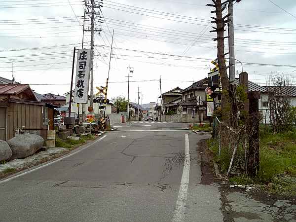 道なりに左へ曲がり「浅間総合病院」の前を通って進んでいくとJR小梅線の踏切を渡る(左・左写真)。