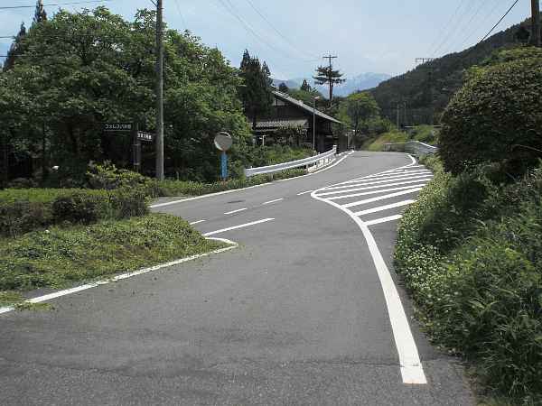 ちょっとした集落を抜けると、国道方面から上ってきた道と合流し、大きく右にカーブする(右・左写真=12:11)。