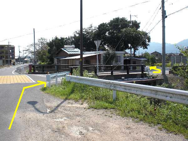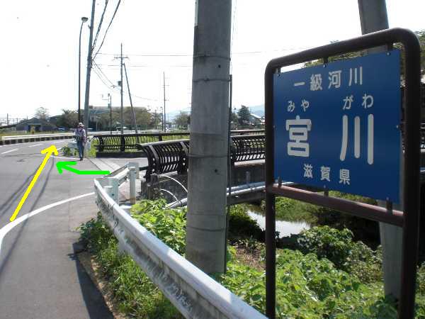 さらにもう少し行った所にある次の小橋を渡る。直進の道路はJR草津線石部駅につながる、近年できた道である(左・右写真=10:52)。