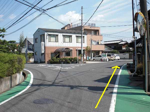 一旦停止の交差点を一つ越えて、次の直進する道路が細くなっている三叉路を