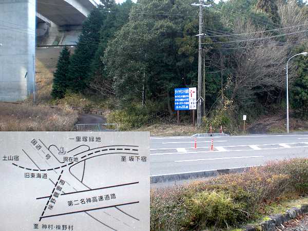 坂を下りきったところは車道との交差点。向こう側に黄色に塗られた旧東海道が見える。