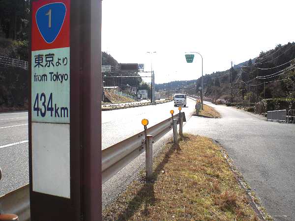 [東京より434Km]の標識。この辺りから国道一号線の上り車線と下り車線に高低差が突き出す(左・右写真=10:56)。