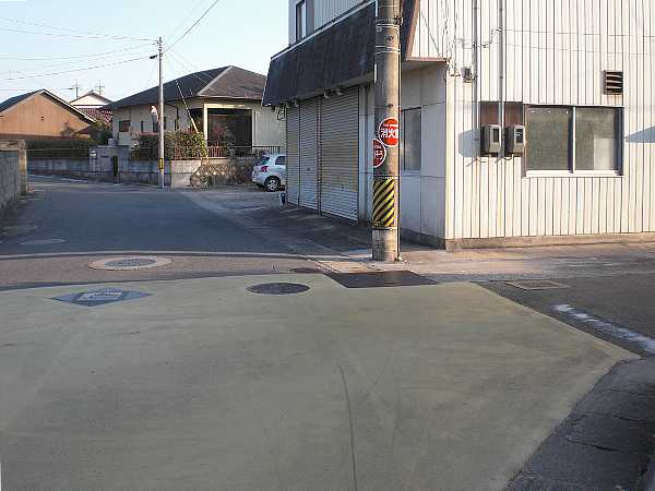 黄色の塗装が途切れた交差点、まっすぐ行ってしまった。すぐに気がつき戻ったが右折する方は黄色が僅かに剥げ残っていた(左・左写真=15:24)。