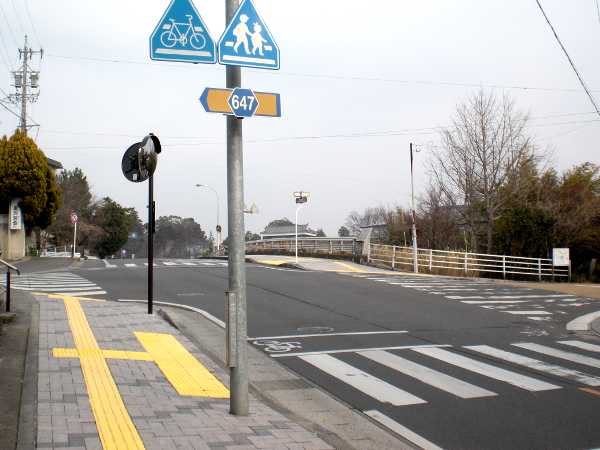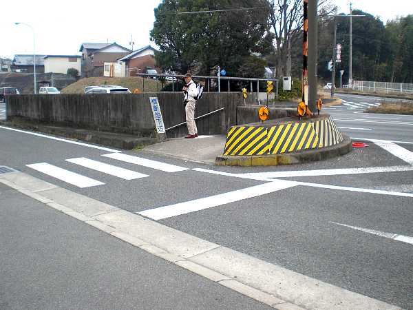 まず、左へ1号線を横断。そこから右へ県道を横断すると旧街道の入口となる(右・右写真=11:23)。