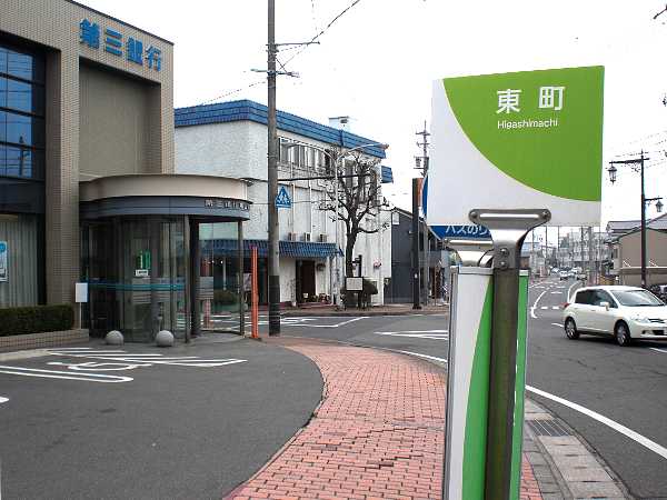 信号を越え次の丁字路、「第三銀行」前「東町バス停」を左折する(左・左写真=9:30)。「
