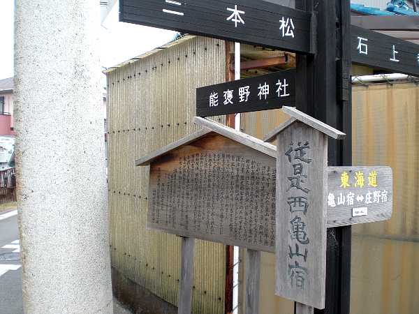 石の鳥居が建っており「これより西、亀山宿」の立て札がある。