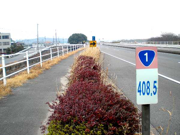 国道1号線の様子。東京まで408.5Kmの標識が見える。もう京都を出発して90Kmほど来たことになる(右・右写真=11:54)。