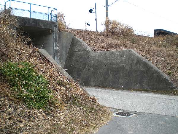 小さな川を渡ると先は関西本線の踏切。ここを右に折れ川沿いに国道1号線下のトンネルをくぐる(左・右写真=11:14)。