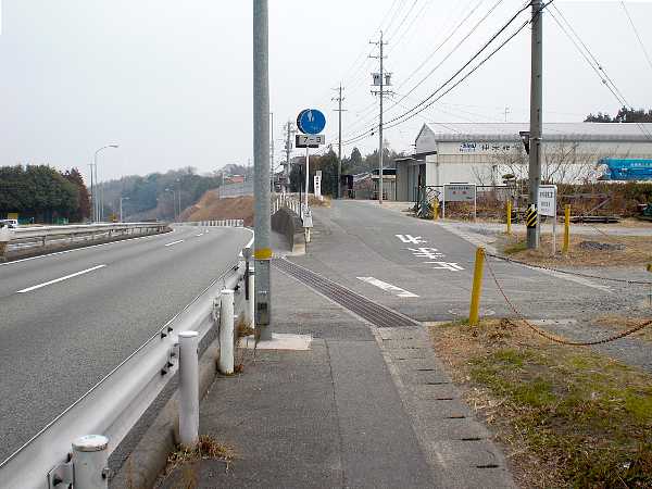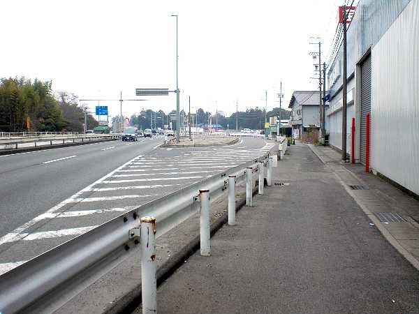 405Kmの標識の辺りから国道を斜めに横切って、旧街道は右手へ延びているのだが、横断歩道が無いため左側道から迂回する(右・左写真=12:56)。